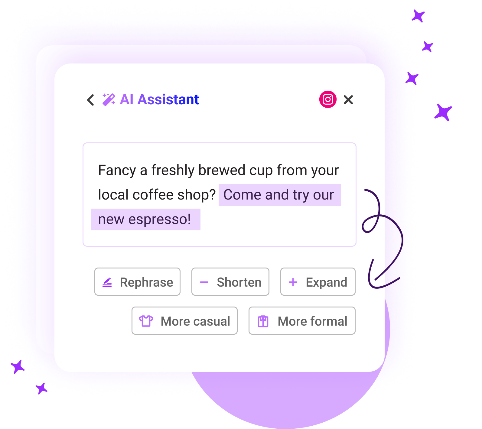Buffer AI Assistant handles the tedious part of social media for you. It’ll come up with instant replies, endless post variations, and can repurpose your content in a click—meaning you can focus on the fun stuff.