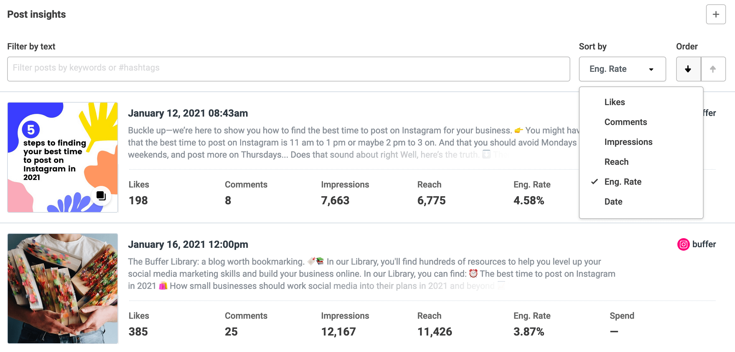 Consider your post timing as well. While there is no “best” time to post for everyone, you can dig into your audience insights to strategically post when your followers are most active. We analyzed millions of posts sent through Buffer to find out the best times to post on Instagram and LinkedIn. For Instagram, the best time to post for engagement is generally between 7 a.m. and 8 a.m. on weekdays. For LinkedIn, the best time to post for high engagement is generally between 9 a.m. and 5 p.m. on weekdays.