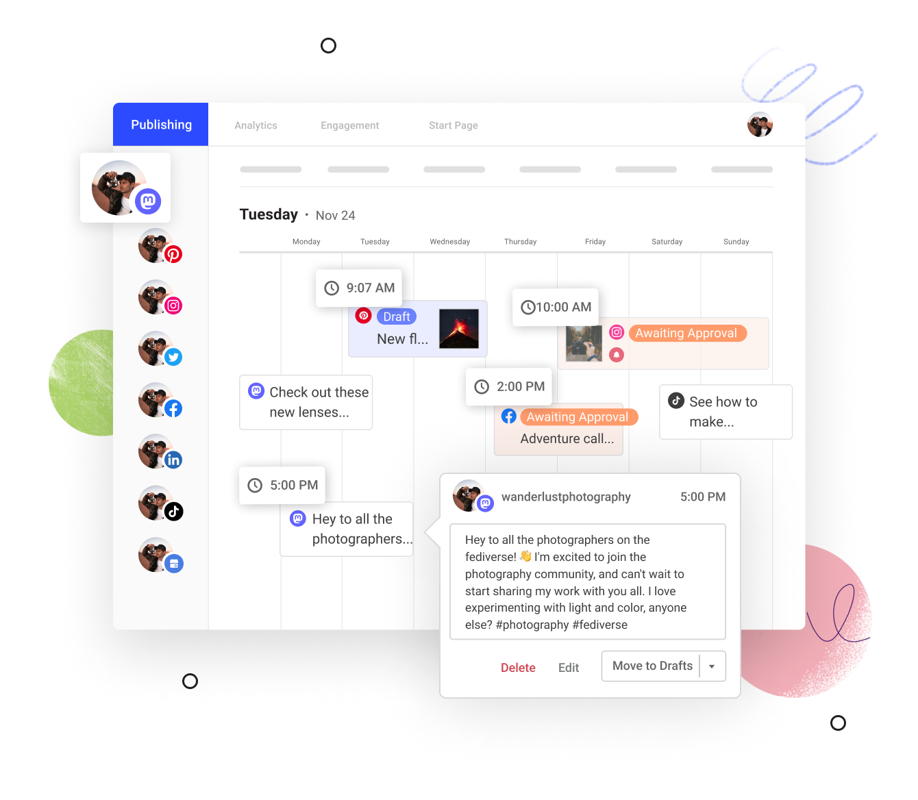 Manage your social content for Mastodon and other platforms from one simple dashboard. Buffer also integrates with Twitter, LinkedIn, Facebook, Instagram, TikTok, Google Business Profile, and Pinterest.