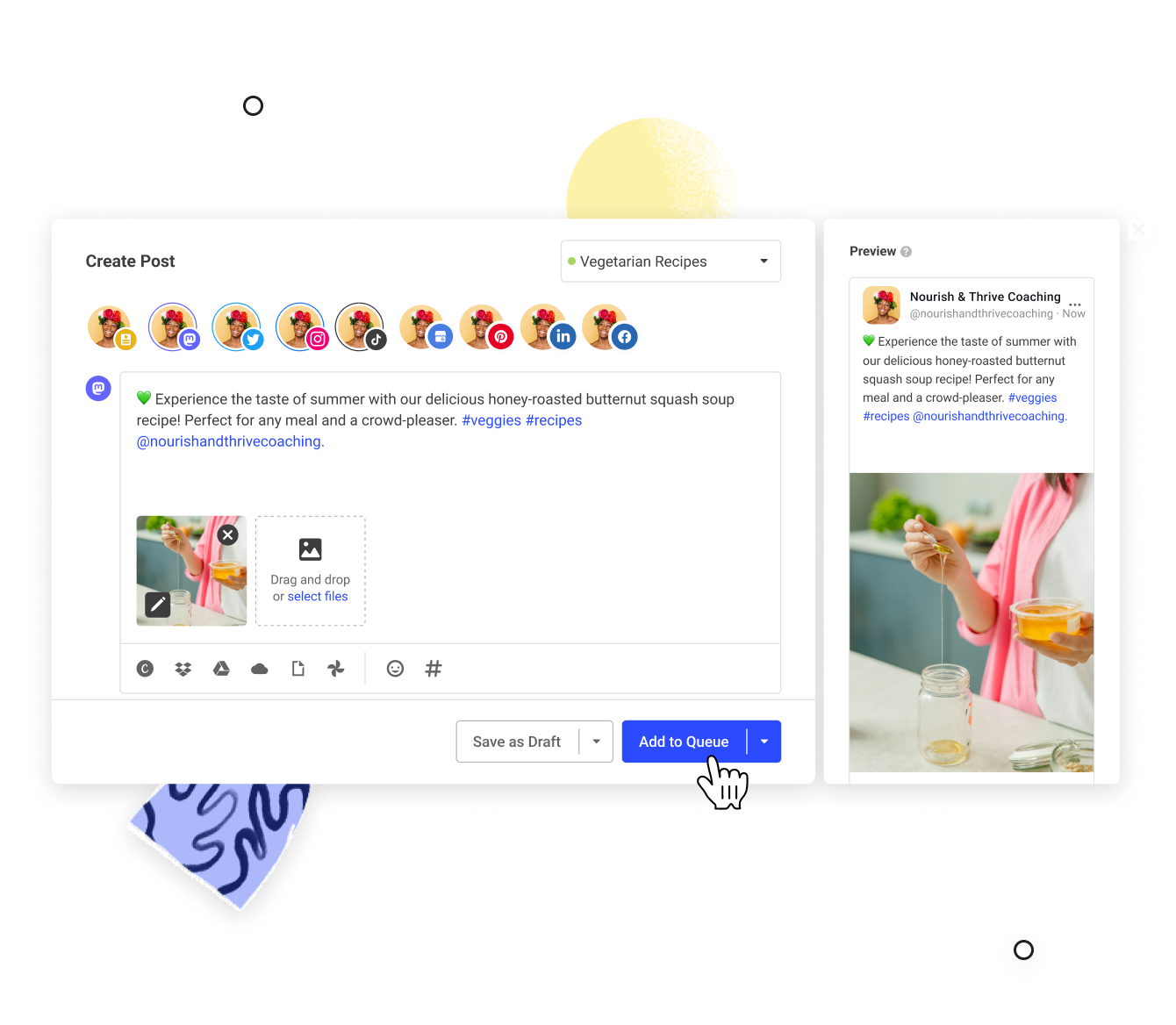 - Click on Add to Queue, Share Now, Schedule Post, or Save as Draft, depending on your scheduling preference