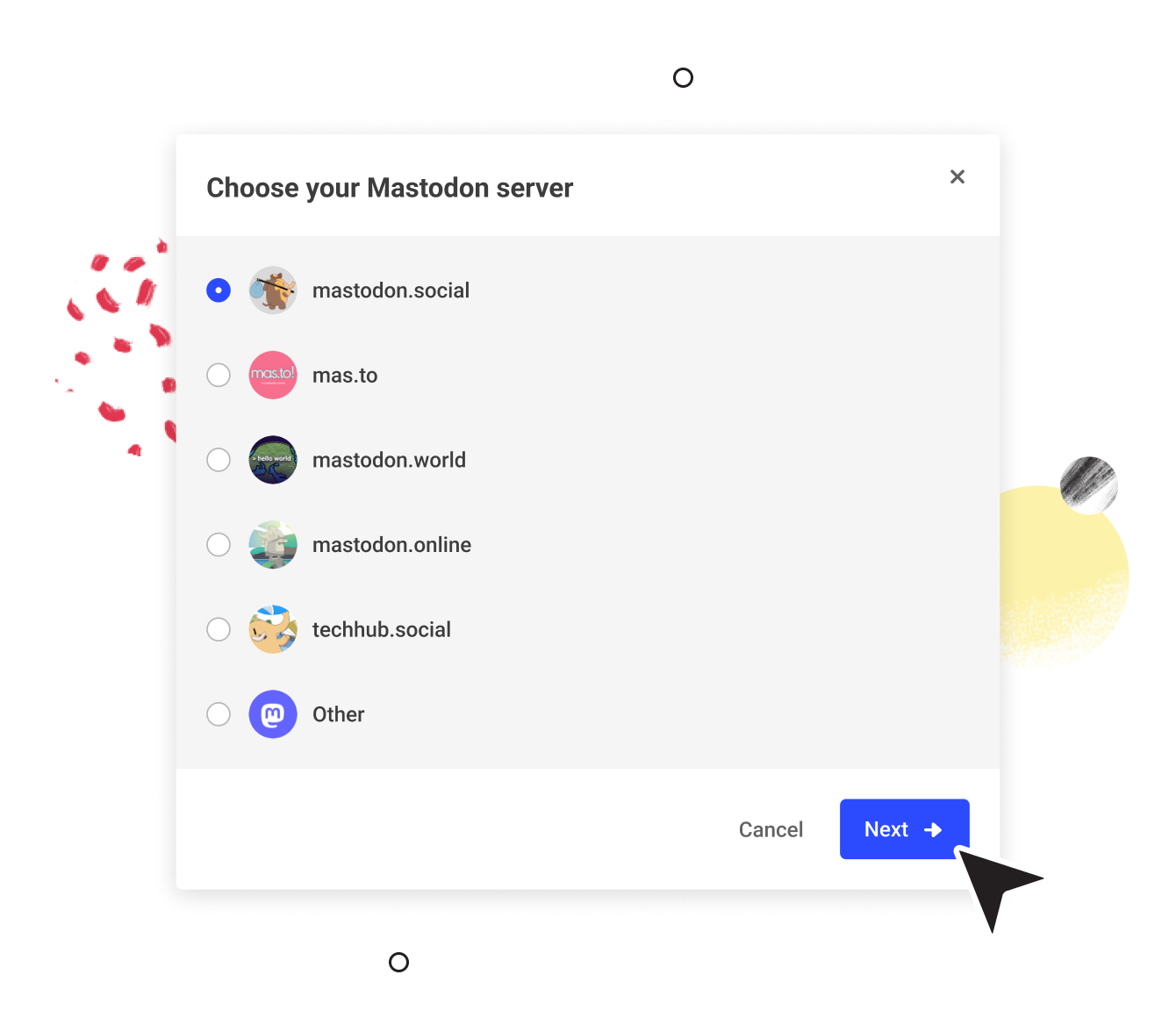 - Once you select Mastodon from the connection screen, you’ll have the choice to select the 5 most popular servers: