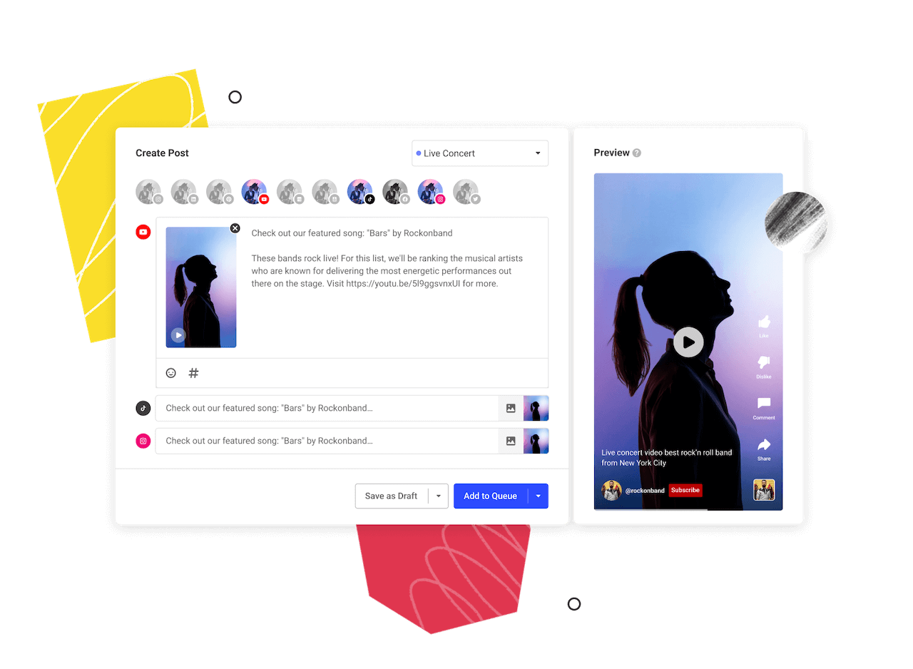 Upload your video once and share it to YouTube, TikTok, Instagram, and more in just a few clicks.